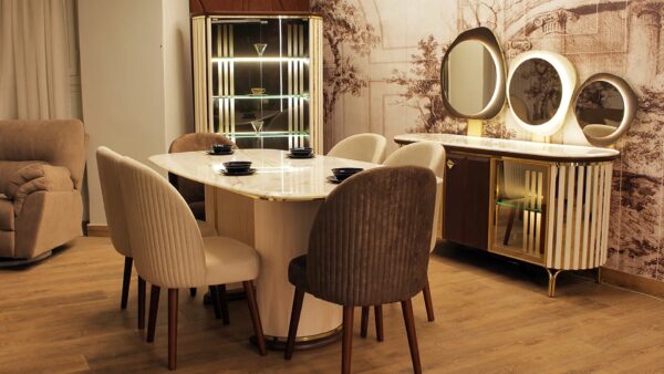غرفة سفرة كاملة لارين – خشب زان أحمر وموسكي مع رخام كرارة إيطالي