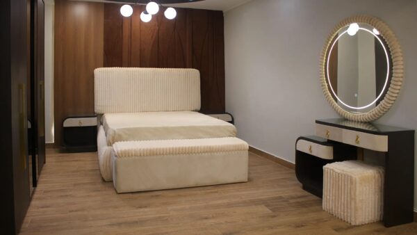 | المكونات | سرير كبير مع بانكيت، 2 كمود، تسريحة مع بف، دولاب كبير |