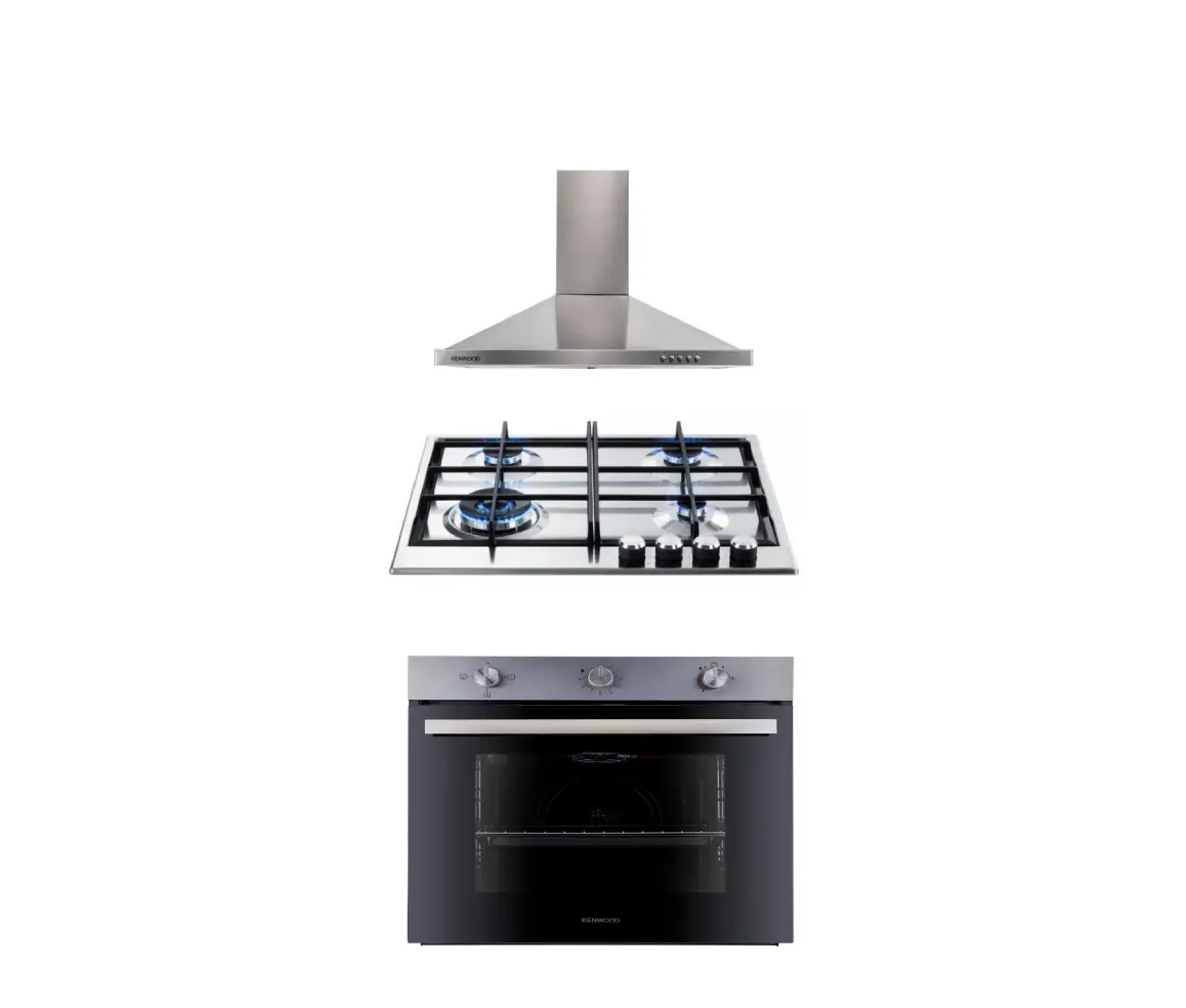- The Kenwood 60 cm built-in set combines gas oven, gas hob, and chimney hood in a sleek, space-saving design.