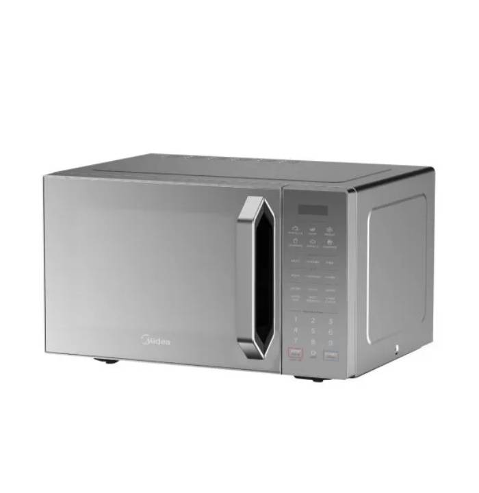 - The Midea microwave features a silver housing with a mirror front for a sleek and elegant design.