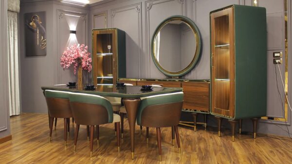 | Set Parts | 2 Small China Cabinets + Buffet with 3 Round Mirrors + Table + 6 Chairs |