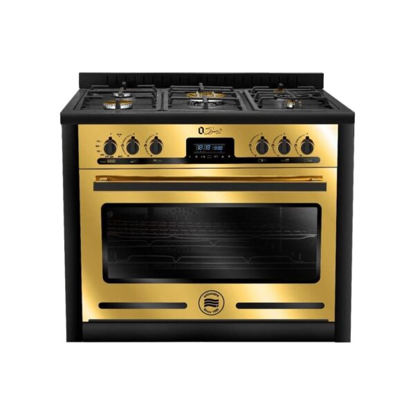 The Unionaire O-Signature 2 Cooker 5 Burners Gas Gold C69EBGC383ICS2FOS2BG2WAL is a high-quality kitchen appliance that blends elegance, functionality, and advanced technology. Its gold exterior, coupled with black sides, makes it a standout addition to any kitchen, while its robust features such as five burners, grill motor, and smart touch timer provide versatility and ease of use. The cooker’s three-layer glass door, oven fan, and durable construction ensure that it is both safe and long-lasting.